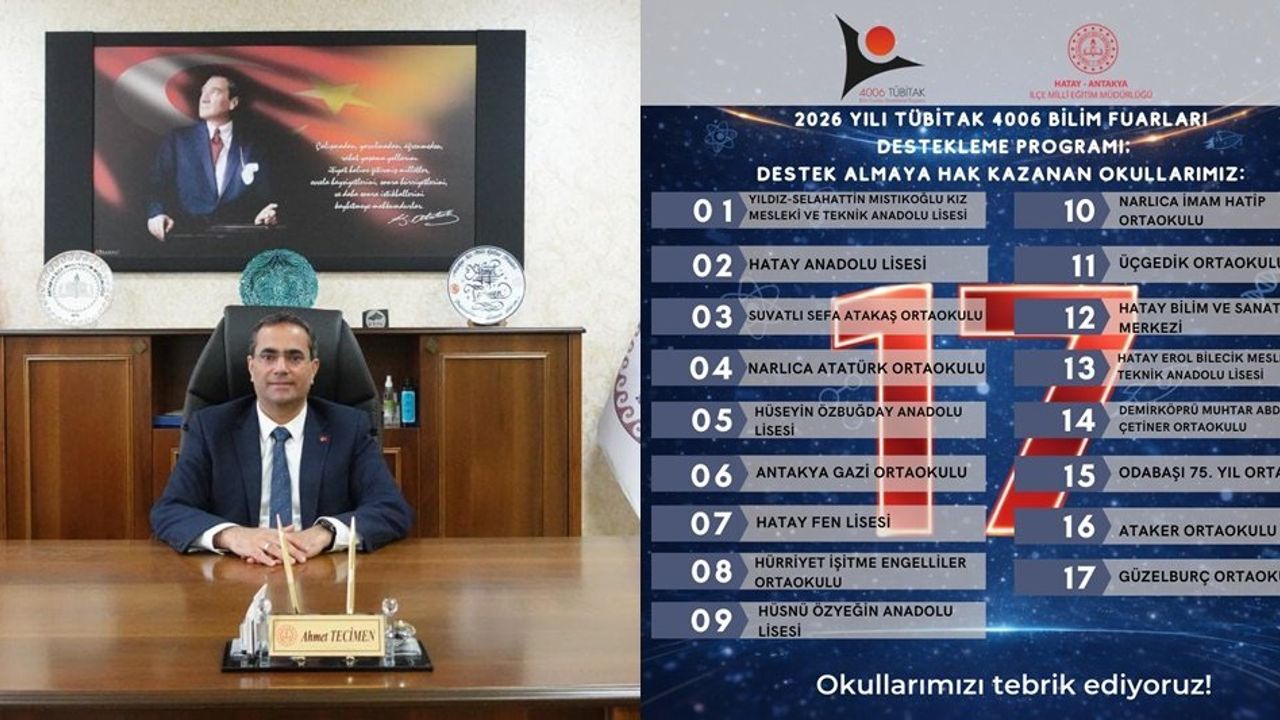 Ahmet Tecimen, 2026 yılı TÜBİTAK 4006 Bilim Fuarları Destekleme Programı 12. dönem sonuçlarının açıklanmasının ardından, Antakya ilçesinden 17 okulun destek almaya hak kazandığını duyurdu.