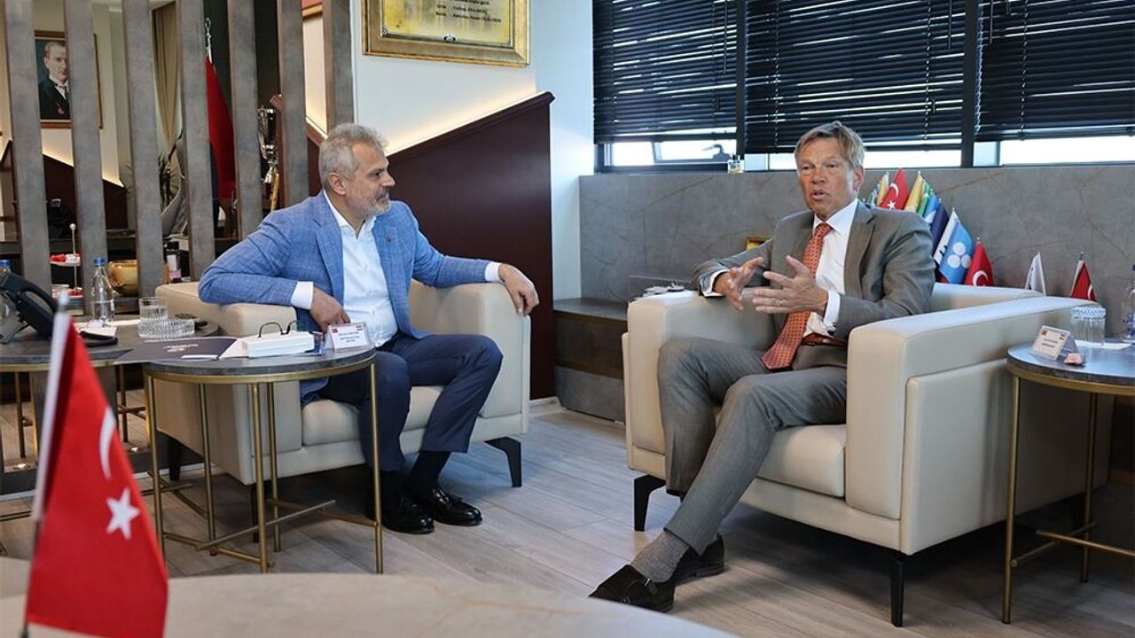 Büyükelçi Joep Wijnands’ı makamında ağırlayan HBB Başkanı Öntürk, 6 Şubat depremlerinin ardından inşa çalışmalarının sürdüğü Hatay’ın ekonomik anlamda da ayağa kalkması için işbirliğinin önemine değindi.