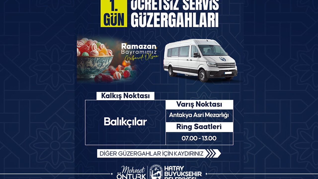 Hatay Büyükşehir Belediyesi (HBB), Ramazan Bayramı’nın birinci günü vatandaşların asri mezarlıkları ziyaretlerini kolaylaştırmak amacıyla ücretsiz servis hizmeti sağlayacak.