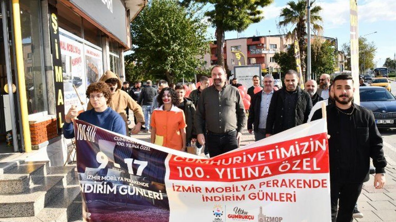 Çiğli Belediyesi’nin katkılarıyla İzmir Mobilya Pazarlamacıları Derneği (İZMOP) tarafından Cumhuriyetimizin 100. Yılı sebebiyle gerçekleştirilen İzmir Mobilya Perakende İndirim Günleri düzenlenen yürüyüş ile başladı.İZMİR (İGFA) - Cumhuriyetimizin 100. Yılı dolayısıyla düzenlenen İzmir Mobilya Perakende İndirim Günleri’nin açılış gününde Çiğli Belediye Başkanı Utku Gümrükçü ve dernek yetkilileri gerçekleştirdiği yürüyüşte Çiğli’de hizmet sunan mobilyacı esnafı ve vatandaşları selamladı. İndirim Günleri 17 Aralık Pazar gününe kadar devam edecek.