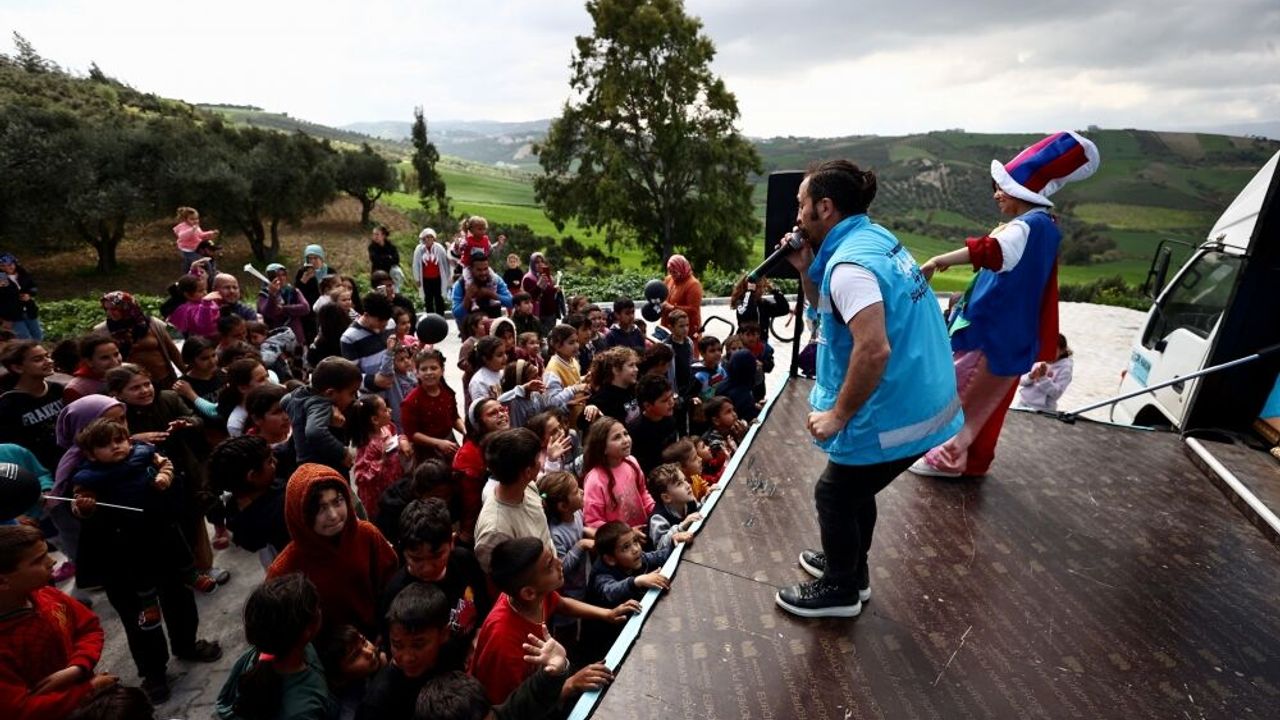 HATAY (AA) - ÖMER ÜRER / EMRE AYVAZ - Kahramanmaraş merkezli 6 Şubat'taki depremlerin ardından bölgede arama kurtarma faaliyetlerine fönüllü olarak katılan tiyatro oyuncusu ve sunucu Murat Demir, İstanbul Bahçelievler Belediyesinin "Hayal Tamirhanesi Mobil Oyun Aracı" ile Hatay'ın kırsal mahallelerini dolaşıyor.