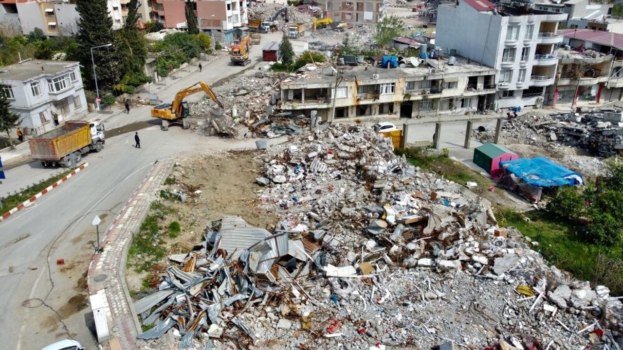 HATAY (AA) - EMRE AYVAZ/ÖMER ÜRER - Kahramanmaraş merkezli 6 Şubat'ta meydana gelen depremlerden etkilenen Hatay'ın Samandağ ilçesinde enkaz kaldırma ve hasarlı binaların yıkım çalışmaları havadan görüntülendi.