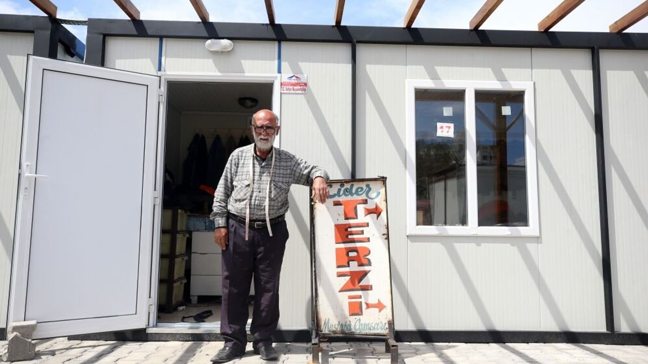 Depremde ağır hasar alan iş yerindeki malzemeleri tahliye eden 63 yaşındaki Çamsarı, ilçe merkezinde oluşturulan konteyner çarşısında yeniden işinin başına geçti.