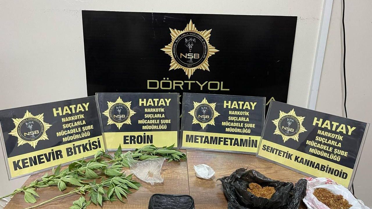 Hatay Emniyet Müdürlüğü ekipleri, uyuşturucu imal ve ticaretine yönelik çalışmaları kapsamında Dörtyol Numune Evler Mahallesi’nde operasyon gerçekleştirdi. H.Ç. isimli şahsın ikametinde yapılan aramada 7,13 gram metamfetamin, 2 parça halinde toplam 58,56 gram sentetik kannabinoid, 1,70 gram eroin ve boyları 20 ile 75 santimetre arasında değişen 3 kök kenevir ele geçirildi.