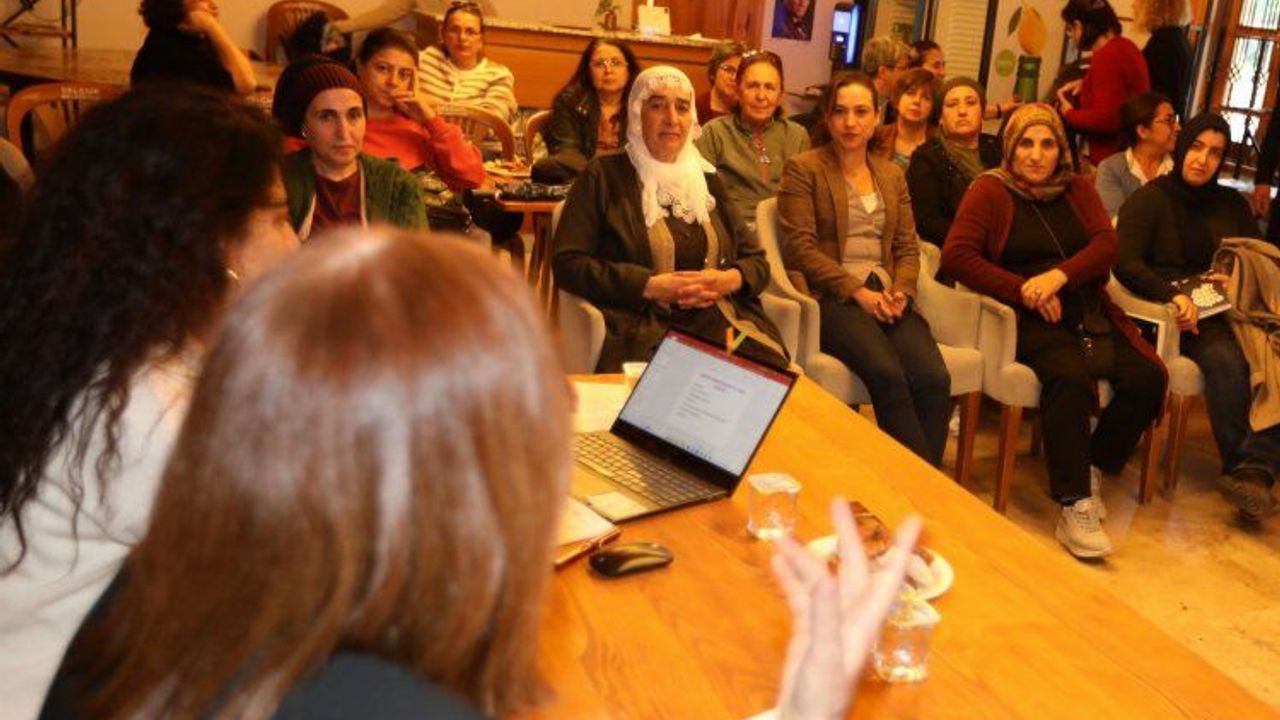 Efes Selçuk Belediye Başkanı Filiz Ceritoğlu Sengel kadınlarla birlikte söyleşiyi dinledi.