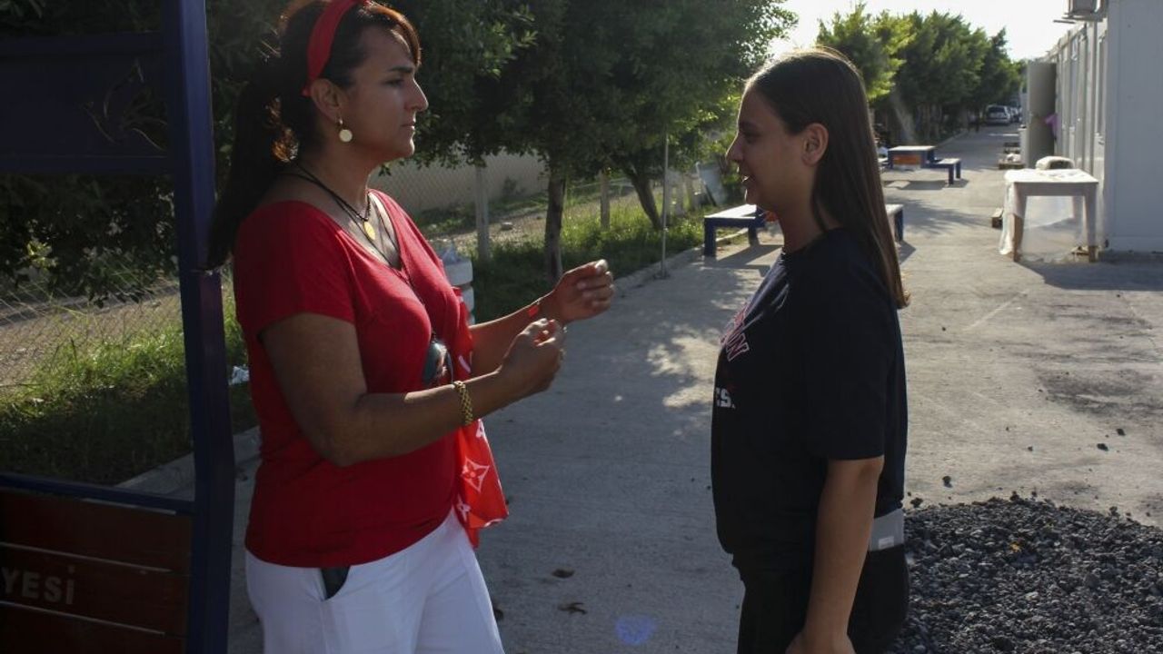 Gölcük Depremi'ni yaşayan kuaför Çevre, yanına aldığı bakım çantasıyla İskenderun'daki konteyner kentlerde kalan kadın depremzedeleri ziyaret etti.