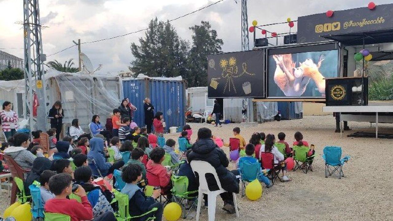HATAY (AA) - İskenderun'da konteyner kentte yaşayan afetzede çocuklar için açık havada sinema gösterimi yapıldı.