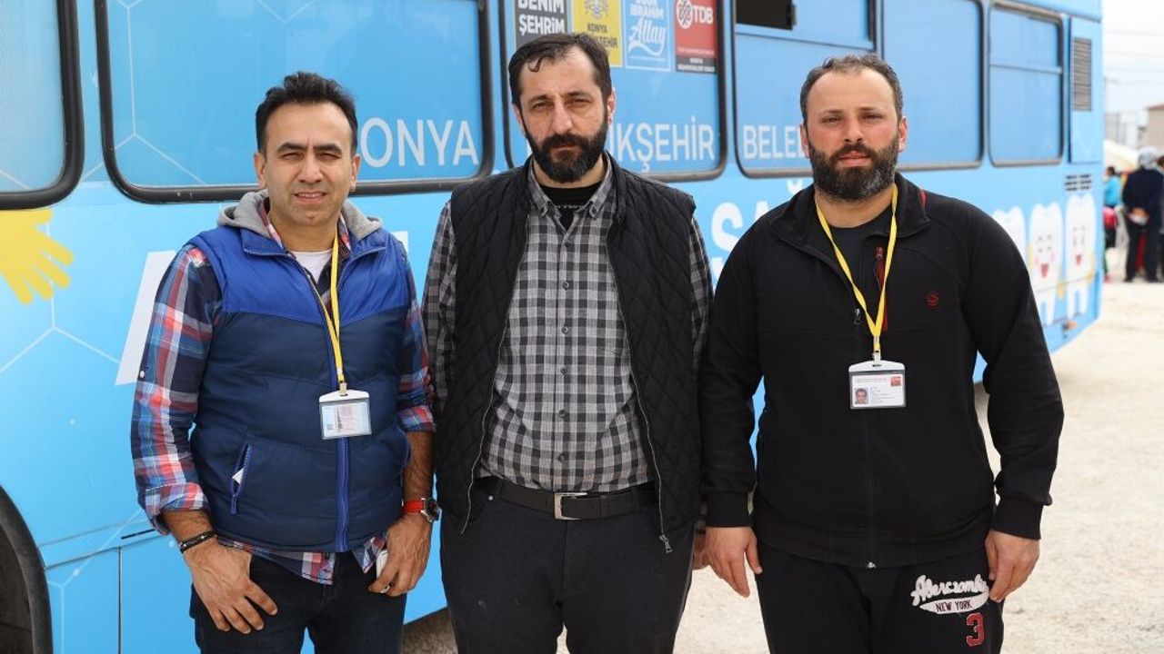 Konya Büyükşehir Belediyesi ile Konya Diş Hekimleri Odası işbirliğinde, 2 hekimin aynı anda hasta alabileceği kapasiteye sahip otobüs, Çekmece Mahallesi'nde depremzedeler için kurulan çadır kentte konuşlandırıldı.