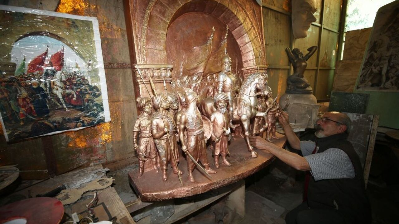 HATAY (AA) - FERDİ UZUN/MEHMET ÇALIK - Hatay'ın İskenderun ilçesinde yaşayan heykeltıraş Rıfat Üstündağ, deprem dolayısıyla az hasar gören Fatih Sultan Mehmet'in İstanbul'a girişinin tasvir edildiği kabartma heykelini tamamlamaya çalışıyor.