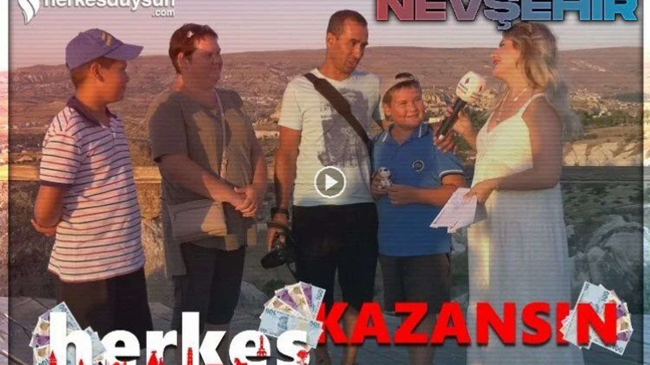 "Türkiye'nin yenilikçi medyası" sloganıyla yola çıkan herkesduysun.com bünyesinde hazırlanan "Herkes Kazansın" isimli para ödüllü bilgi yarışmasının altıncı bölümü yayında. Bu bölümde durağımız Nevşehir!NEVŞEHİR (İGFA) - “Türkiye’nin yenilikçi medyası” sloganıyla yola çıkan herkesduysun.com bünyesinde hazırlanan Herkes Kazansın isimli para ödüllü bilgi yarışmasının bu haftaki durağı Nevşehir oldu. Genel kültür soruları ile vatandaşın karşısına çıkan Herkes Duysun ekibi, bu hafta Nevşehirlilere kazandırdı.