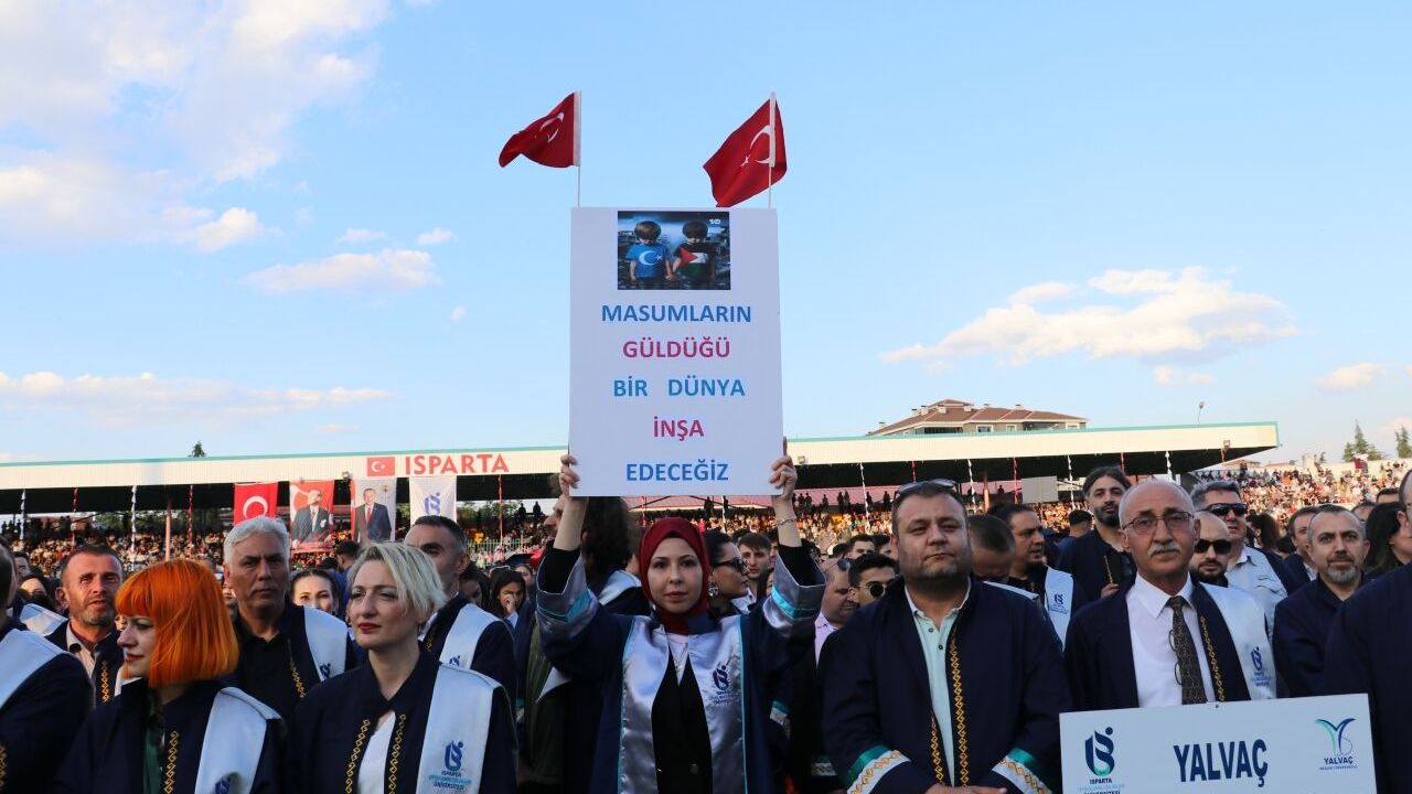 ISPARTA (AA) - Isparta Uygulamalı Bilimler Üniversitesi (ISUBÜ) öğrencileri, mezuniyet töreninde İsrail'in Filistin'e yönelik saldırılarına pankartlarla tepki gösterdi.