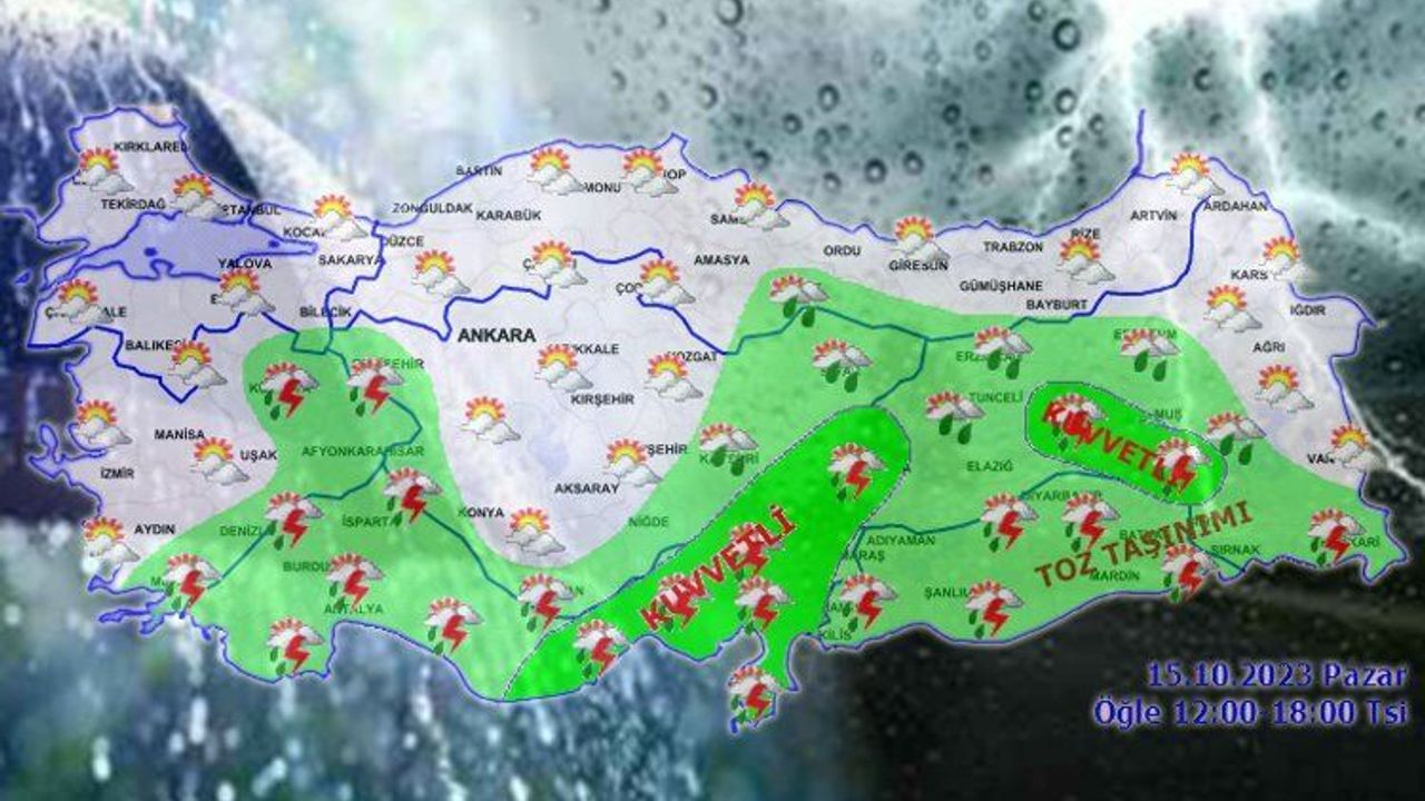 Meteoroloji'den yapılan son değerlendirmelere göre; Doğu Akdeniz’in doğusu ile Doğu ve Güneydoğu Anadolu’nun batısında toz taşınımı beklendiğinden görüş mesafesinin düşme, hava kalitesinde azalma gibi olumsuzluklara karşı dikkatli ve tedbirli olunması istendi. Ülke geneli ise parçalı ve yer yer çok bulutlu olurken, güney ve günyey doğu illeri için kuvvetli yağış uyarısı geldi.BURSA (İGFA) - Meteoroloji Genel Müdürlüğü, 15 Ekim Pazar gününe ilişkin hava tahmin raporunu yayımladı.