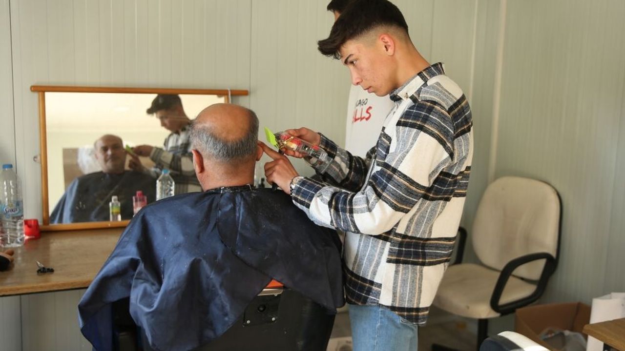 Osmaniye Halk Eğitimi Merkezince Fakıuşağı Mahallesi'ndeki eğitim yerleşkesine konulan konteynerde, usta öğretici ve öğrenciler ile gönüllü kuaförler, depremzedeleri tıraş edip saç bakımlarını yapıyor.