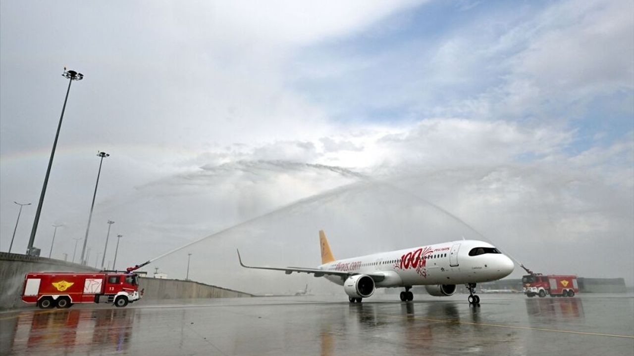 İSTANBUL (AA) - Pegasus Hava Yollarının Cumhuriyet’in 100. yılında filosuna kattığı "Cumhuriyet" isimli 100. uçağı, İstanbul Sabiha Gökçen Havalimanı’na indi.