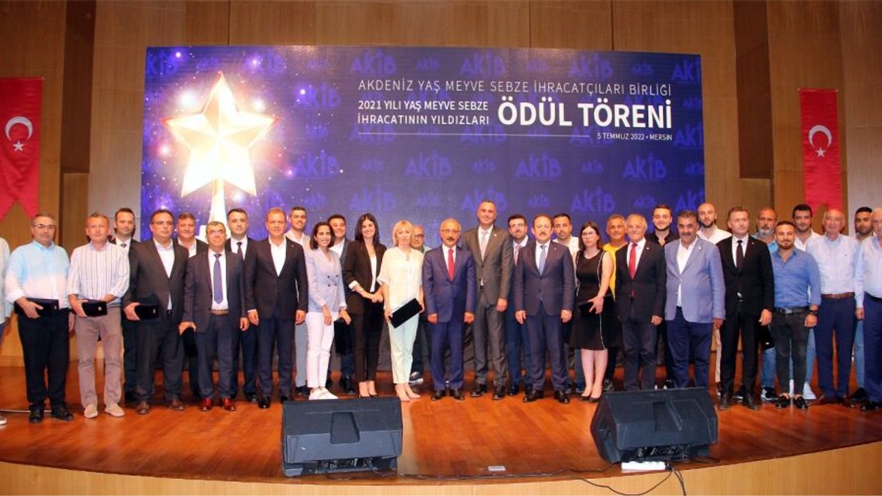 Düzenlenen ödül töreninde Türk yaş meyve ve sebze sektörüne çeşitli unvanlarla uzun yıllar hizmet veren duayen ihracatçılara onur ödülleri de takdim edildi. Akdeniz İhracatçılar Birliği (AKİB) hizmet binasındaki Mersin Salonu'nda Akdeniz Yaş Meyve Sebze İhracatçıları Birliği Yönetim Kurulu Başkanı Ferhat Gürüz'ün ev sahipliğinde gerçekleştirilen 2021 Yılı Yaş Meyve Sebze İhracatının Yıldızları Ödül Töreni'ne Mersin Valisi Ali Hamza Pehlivan, Hazine ve Maliye Eski Bakanı Lütfi Elvan, Mersin Büyükşehir Belediye Başkanı Vahap Seçer, Mersin Ticaret ve Sanayi Odası Başkanı Ayhan Kızıltan, Mersin Ticaret Borsası Başkanı Abdullah Özdemir, Türkiye İhracatçılar Meclisi (TİM) Yönetim Kurulu Üyesi Ali Kavak, AKİB'e bağlı ihracatçı birliklerinin başkanları, sivil toplum kuruluşları yöneticileri ile çok sayıda sektör temsilcileri katıldı.